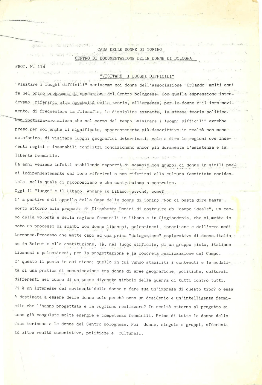 Preceduto da un articolo di Elisabetta Donini su “il manifesto” del 23 febbraio 1987 (doc.1), la Casa delle donne di Torino diffuse un appello (doc.2) per organizzare un campo ideale di pace di sole donne a Beirut, città martoriata dal sovrapporsi di guerre civili e conflitti regionali che coinvolgevano le relazioni tra Israele e i paesi confinanti.